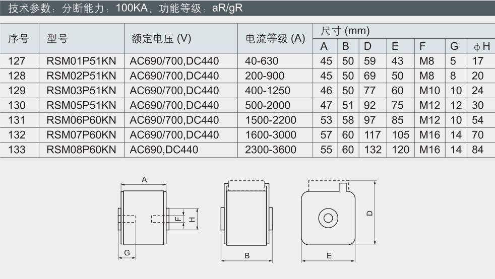 一、概述 英施丹制造的RS系列半導(dǎo)體器件保護用熔斷器(以下簡稱快速熔斷器)適用于交流50HZ,額定電壓250-1000V,額定電流30-5000A的電路中,作為整流二極管,晶閘管及其由半導(dǎo)體器件組成的成套變流裝置短路和某些不允許過電流的過載保護。 快速熔斷器符合國家標(biāo)準(zhǔn):GB13539.1-92,GB13539.4-92等效采用國際電工委員會標(biāo)準(zhǔn);IEC269-1,IEC269-4。 快速熔斷器經(jīng)中國質(zhì)量檢測中心指定的低壓電器試驗站進行了型式試驗,全部試驗項目合格。 快速熔斷器額定容量大,分斷能力高,熔斷速度快,限流特性顯著,過電壓低,分斷I2T小,額定功率損耗低,體積小,安裝方便,安全可靠以及熔斷后指示可靠等特點。
