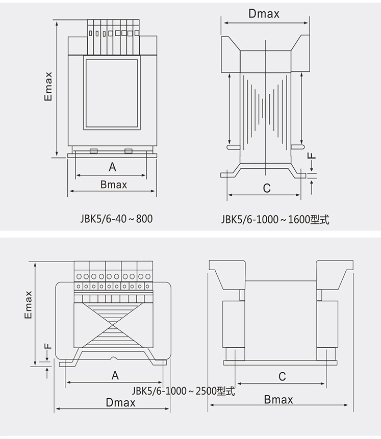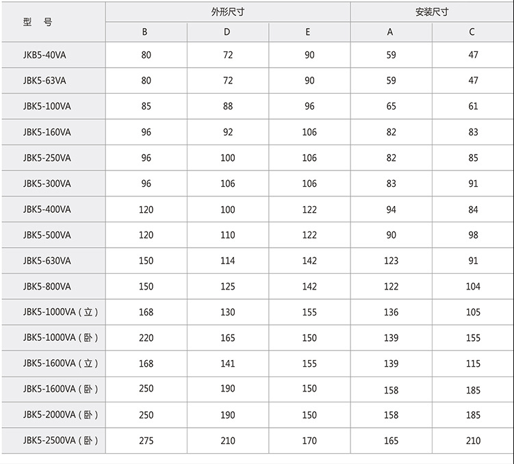 JBK1.2.3.5控制變壓器 一、產(chǎn)品特點 JBK5系列機(jī)床控制變壓器是我們公司引進(jìn)德國90年代中期型變壓器系列,在國內(nèi)JBK3系列機(jī)床控制變壓器基礎(chǔ)上,經(jīng)過多年來進(jìn)一步吸收國外同類產(chǎn)品,并優(yōu)選國外先進(jìn)方法的接線端子的結(jié)構(gòu)、將端子與骨架合在一起,使防護(hù)等級提高到IP2LX,防止偶然觸及電路。英施丹采用國內(nèi)IT冷壓接線端子,接線方式可以使接線密集程度提高。變壓器的硅鋼片與硅鋼片之間連接、硅鋼片與底板連接采用氬弧焊焊接工藝,形成以個整體,簡捷明了。尤其是底板性成型,安裝尺寸較JBK3系列更為準(zhǔn)確,而采用優(yōu)質(zhì)防蝕合金材料,大大增高了接地性能的可靠性,全面提高了產(chǎn)品質(zhì)量,該產(chǎn)品符合VDE0550、IEC204-1、EC439、JB5555、GB5226等有關(guān)國際、國家標(biāo)準(zhǔn),并榮獲共體CE,美國UL?膳c國外產(chǎn)品互換使用。 二、產(chǎn)品用途 JBK5系列機(jī)床控制變壓器適用于交流50/60Hz,輸入電壓不超過500V,輸出額定電壓不超過220V,作為各行各業(yè)的機(jī)械設(shè)備、一般電器控制電源及工作、信號燈的電源之用。 三、使用環(huán)境 1周圍空氣溫度-5℃至 40℃,24小時的平均值不超過 35℃; 2安裝地點海拔不超過2000m; 3 大氣相對濕度在周圍空氣溫度為 40℃時不超過50%,在較低溫度下可以有較高的相對濕度,濕月的平均濕度為90%,同時該月的月平均溫度為 25℃,并考慮到因溫度變化發(fā)生在產(chǎn)品表面的凝露 四、產(chǎn)品結(jié)構(gòu) JBK5變壓器結(jié)構(gòu)可分為芯式,按安裝方式可分為臥式 .