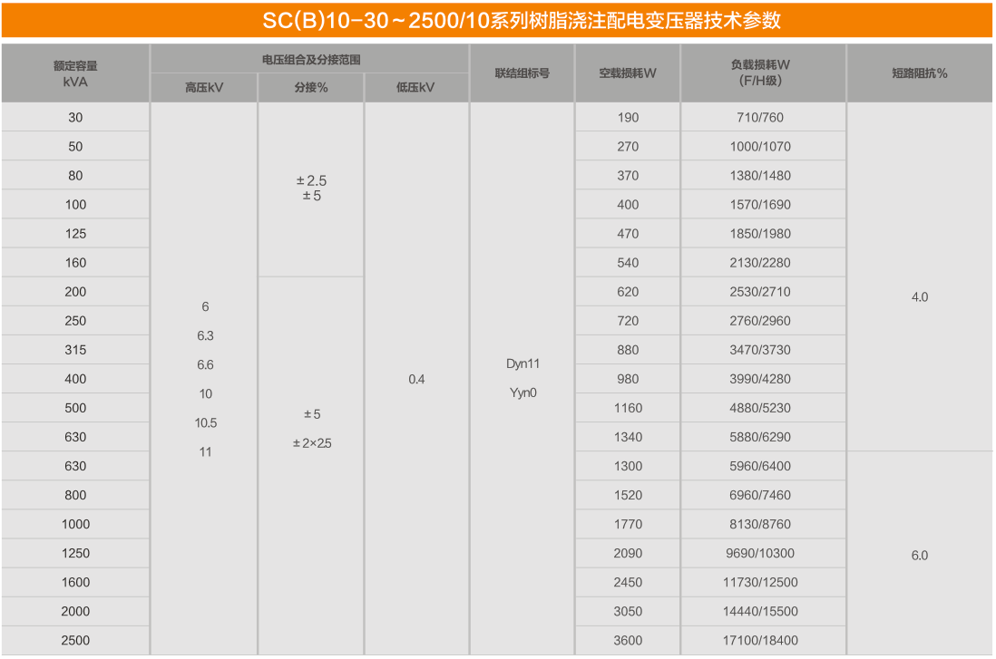 產(chǎn)品特點(diǎn)干式變壓器250KVA315KVA400KVA500KVA630KVA800KVA1000KVA1250KVA1600KVA2000KVA2500KVA 安全:難燃防火,無污染,耐腐蝕性好,可直接安裝在負(fù)荷中心。 防潮:可在 濕度下正常運(yùn)行。 免維護(hù):安裝簡便,綜合運(yùn)行成本低。 優(yōu)良性能:損耗低,局部放電量低,噪聲小,機(jī)械強(qiáng)度高,抗短路能力強(qiáng),散熱能力強(qiáng),強(qiáng)迫風(fēng)冷條件下可以130%額定負(fù)載運(yùn)行。 溫控保障:配備有完善的溫度保護(hù)控制系統(tǒng),為變壓器安全運(yùn)行提供可靠保障。據(jù)對已經(jīng)投入運(yùn)行的產(chǎn)品的運(yùn)行報(bào)告,產(chǎn)品的可靠性指標(biāo)已經(jīng)達(dá)到國際先進(jìn)水平。 使用條件• 海拔≤1000m,-25℃≤環(huán)境溫度≤40℃,戶內(nèi)式。對空氣自冷與強(qiáng)迫風(fēng)冷的變壓器,均需保證變壓器具有良好的通風(fēng)能力。當(dāng)變壓器安裝在地下室或其他通風(fēng)能力較差的環(huán)境,須增設(shè)散熱通風(fēng)裝置。保護(hù)等級有IP00、IP20、IP23等型式。 • 當(dāng)海拔>1000米時(shí)或是環(huán)境溫度大于40℃或者小于-25℃時(shí),產(chǎn)品須按照GB1094.11《電力變壓器第11部分:干式變壓器》的要求對有關(guān)額定值作相應(yīng)調(diào)整。 技術(shù)參數(shù)